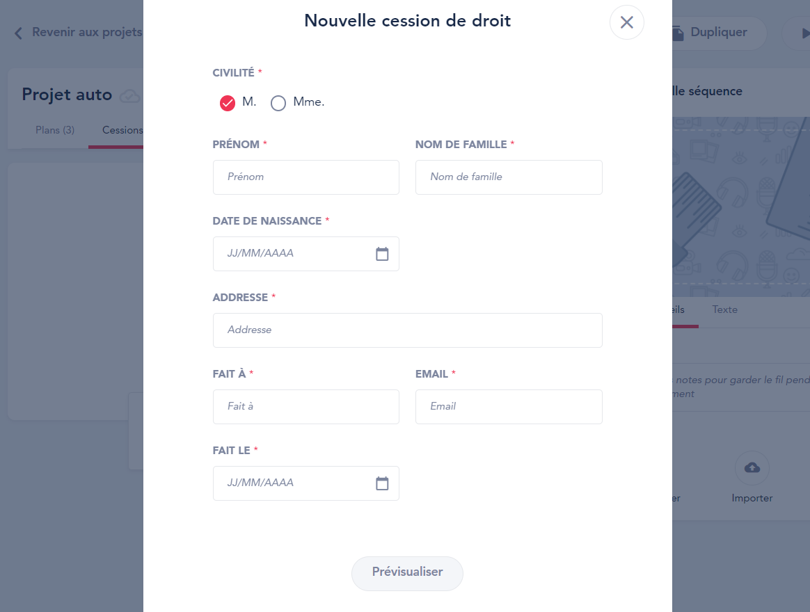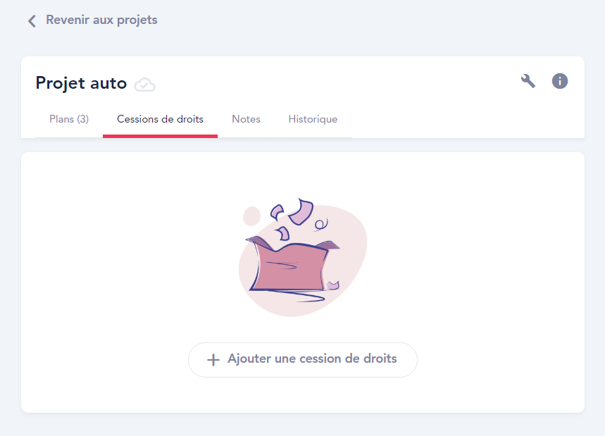 Une fois que vous avez créé votre projet et que vous l'avez nommé, vous pouvez ajouter une cession de droits à ce dernier en suivant ces quelques étapes :