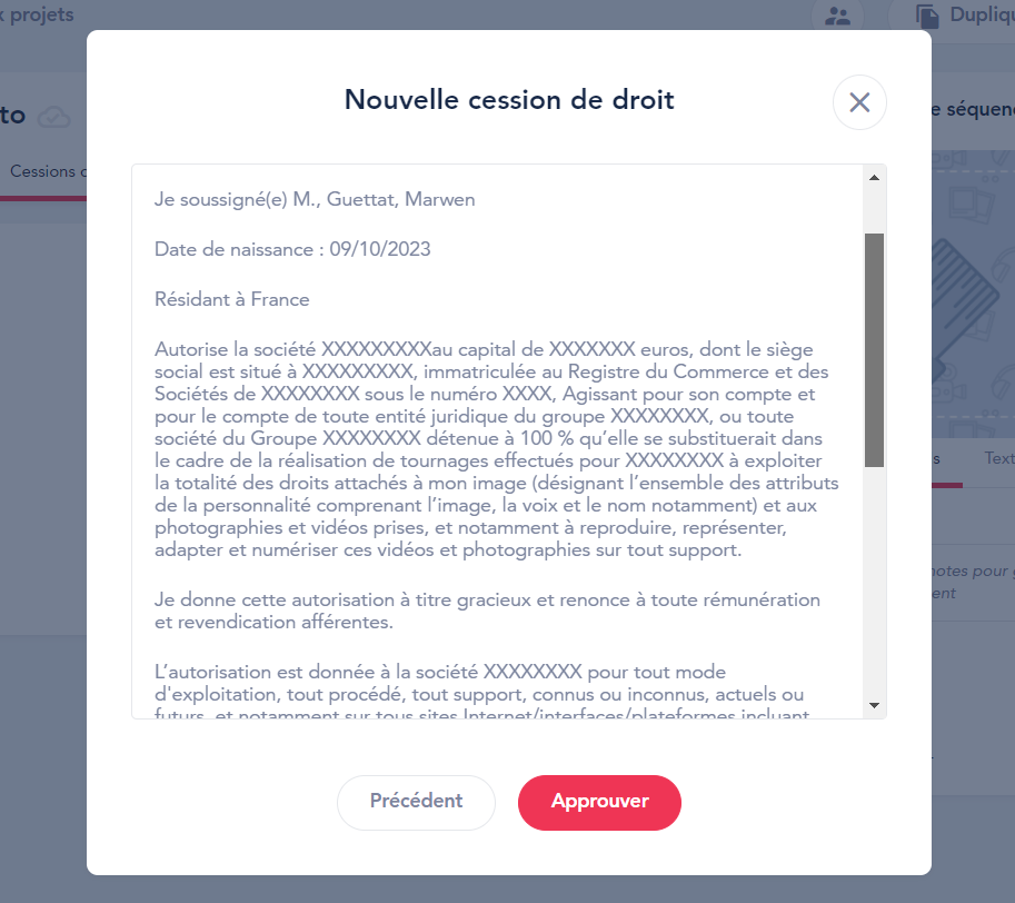 - Cliquez sur le bouton Approuver, pour passer à l'étape suivante si la cession de droits vous convient