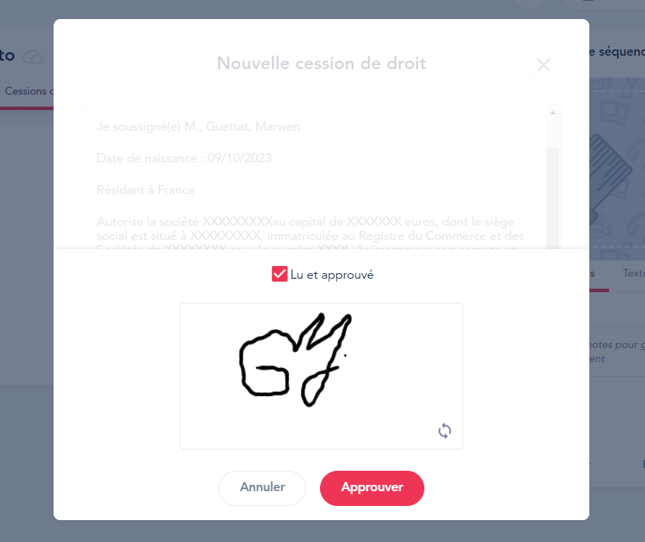 - Cochez Lu et Approuvé puis signer la cession de droits dans l'encart réservé à ce but
